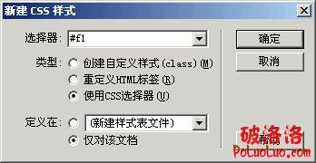 4.在“新建css樣式”對話框中,類型中選擇“使用CSS選擇器”,在選擇器中,輸入#加上id名稱。實例中輸入#f1。