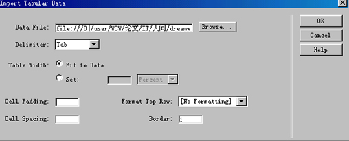 2、在Dreamweaver MX編輯窗口中單擊“Insert/Table Objects/Import Tabular Data...”,打開“Import Tabular Data”對話框,如圖1所示。