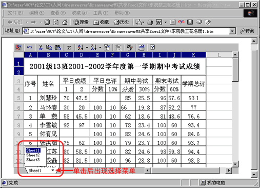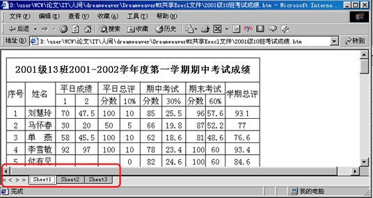 2、在“保存”中有兩個選項:“整個工作簿”和“選擇:工作表”。選擇“整個工作簿”是將整個工作簿中的所有工作都轉換為HTML文件,若原工作簿有三個工作表sheet1、sheet2和sheet3,保存為HTML文件後會形成一個HTML文件和一個相應的文件夾,文件夾中包含了三個HTML文件的信息,用IE浏覽器打開HTML文件後,通過底部的按鈕可對三個HTML文件轉換浏覽,如圖4所示。
