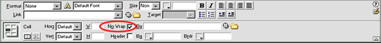 5、選中所有單元格,在屬性面板中勾選No Wrap後復選框,如圖2所示,這樣單元格中數據將不換行顯示,在IE中浏覽時可能在水平方向上超過顯示屏幕顯示。