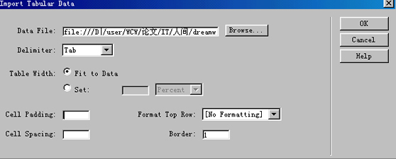 3、把文本文件導入到Dreamweaver MX中。在Dreamweaver MX編輯窗口中單擊“Insert/Table Objects/Import Tabular Data...”,打開“Import Tabular Data”對話框,如圖2所示。在對話框中單擊“Browse...”按鈕,找到要導入的TXT文件,雙擊此文件填加到Data File欄中。其它選項可采用默認設置。單擊“OK”按鈕,Word XP文件中數據被導入到Dreamweaver MX。