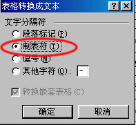 1、將表格轉換成文本。把Word XP文件中表格之外的文字全部刪除,只保留表格,單擊“表格/轉換/表格轉換成文本”,在“表格轉換成文本”對話框中“文字分隔符”選擇“制表符”,如圖1所示。
