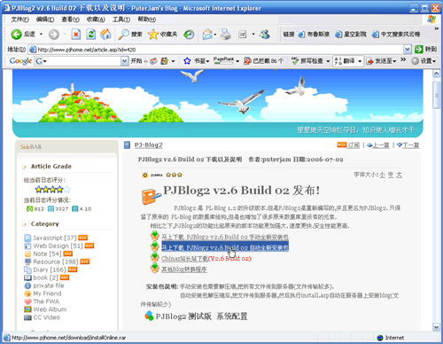 打開 http://www.pjhome.net/article.asp?id=420 選擇“馬上下載 PJBlog2 v2.6 Build 02 自動全新安裝包”