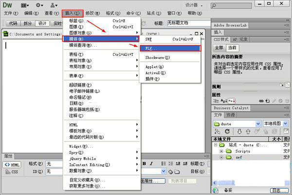 1. 打開HTML文檔,點擊“插入”菜單,選擇“媒體”命令,在彈出的子菜單中選擇“FLV”項: