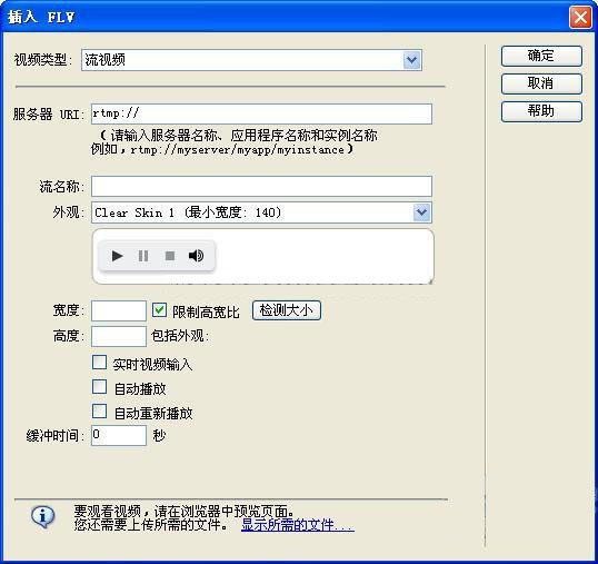 寬度:指定FLV文件的寬度。單位是像素。單擊“檢測大小”按鈕,Dreamweaver會自動指定FLV文件的准確寬度。如果不能指定寬度,那麼必須手工鍵入寬度值。