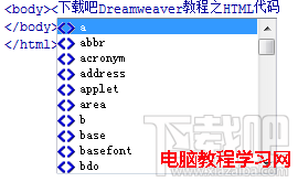 7.把光標移到文本“下載吧Dreamweaver教程之HTML代碼”前面,輸入“<”DW會開啟代碼提示功能。輸入<h1>。