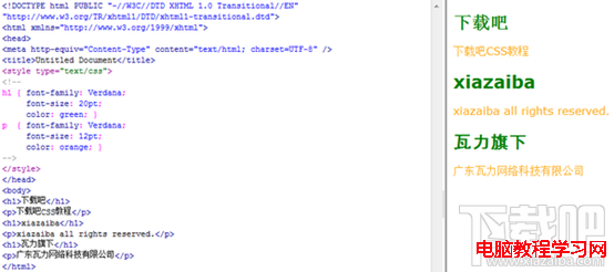 <body> <h1><font face="Verdana" size="5" color="green">下載吧</font></h1> <p> <font face="Verdana" size="4" color="blue">下載吧CSS教程</font></p> <h1><font face="Verdana" size="5" color="green">xiazaiba</font></h1> <p> <font face="Verdana" size="4" color="blue">xiazaiba all rights reserved.</font></p> <h1><font face="Verdana" size="5" color="orange">瓦力旗下</font></h1> <p> <font face="Verdana" size="4" color="blue">廣東瓦力網絡科技有限公司</font></p> </body>