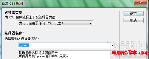 8.選擇器類型為“類”,然後在“選擇器名稱”框中輸入“.green” (如閣4.25所示)。單擊“確定”按鈕。