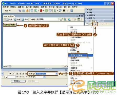 ( 1 )輸入文字並設置超鏈接。在網頁中輸入文字,因為單獨的文本文字是無法添加行為的,按照 Dreamweaver 中的約定,將文字的超鏈接設置為“ javascript:; ”才能夠添加行為。所以將文字的超鏈接設為“ javascript:; ”,並執行【顯示彈出式菜單】行為,如圖 17-3 所示。