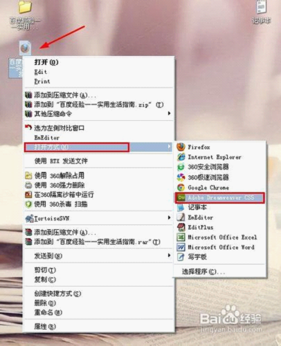 6.接著在桌面上找到已經下載好的網頁文件,右鍵在打開方式中選擇使用DW打開,如圖所示;