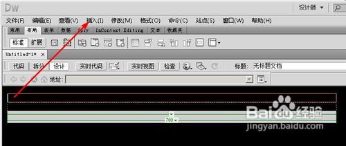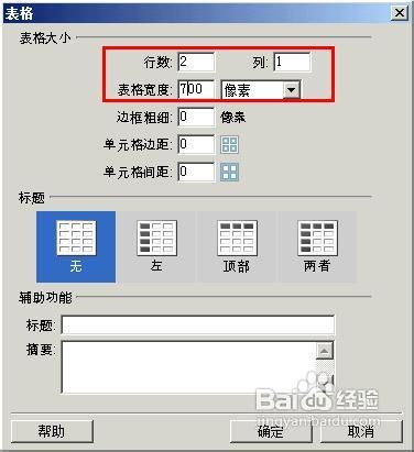 2.插入一個2行1列的表格,如圖所示,猜菜單欄上執行:插入表格,打開插入表格對話框,將表格寬度設置為700像素。