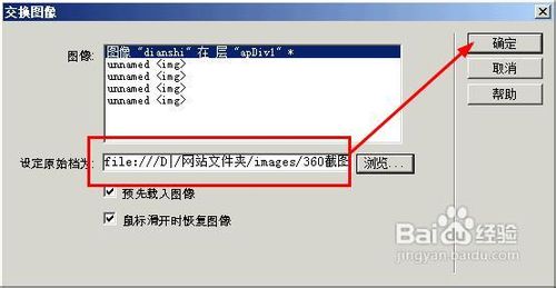 13.打開交換圖像對話框,我們看到這裡有dianshi這個圖像,選中它,然後再設置為原始檔為你要展示的另一個圖片,點擊浏覽按鈕即可選擇圖片,選擇好了以後點擊確定。