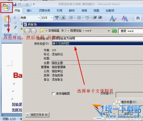 2、點擊開始,然後選擇另存為。就可以看到另存為的對話框。選擇保存類型為單個文件網頁。