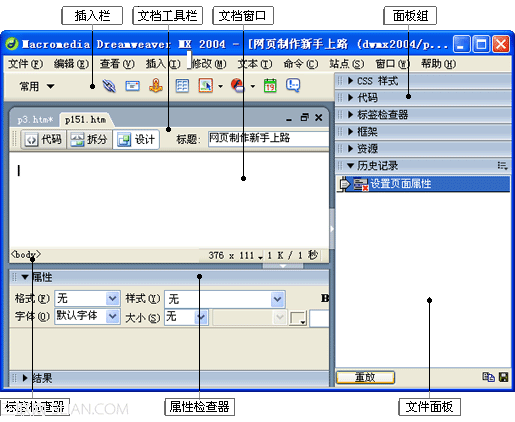 Dreamweaver MX 2004提供了多種此處未說明的其他面板、檢查器和窗口。若要打開其它面板,請使用“窗口”菜單。