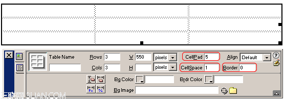 2、在屬性面板中定義表格的Border為0,CellPad為5(這項可使單元格中的內容與單元格邊緣之間保持5個像素);CellSpace為1(此項使得單元格之間保持1個項素的間距)。如圖三;