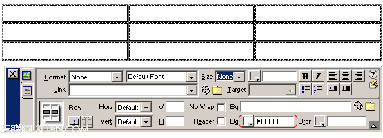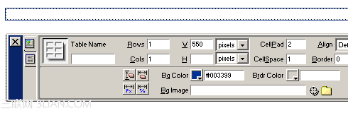 1、使用Object面板插入一個表格,定義表格寬、高及行數和列數。注意此時Dreamweaver中插入表格的默認CellPad和CellSpace、Border都為0。如圖二;