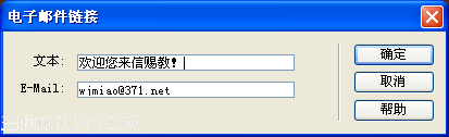 或點插入菜單選“電子郵件鏈接”彈出如下對話框,填入E-Mail地址即可。