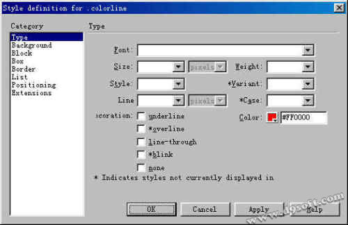 在type項目中,選擇想要的顏色,比如說紅色,然後點ok,再點done,於是一個新的樣式就建好了。選定網頁編輯窗口中的細線,點 Text | CSS style | colorline(colorline就是剛才建立的那個新樣式),在網頁編輯窗口中,線的顏色依然還是灰色,但按F12預覽,在浏覽器中就可以看到所插入細線的顏色已經變成了你想要的紅色。