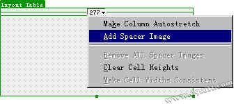Object面板 首先點選Objiect面板的View 中的layout view(布局視圖),再點draw layout table,在網頁編輯窗口中拖動生成一個布局表格(layout table),點表格頭的下拉菜單中的Add spacer image。