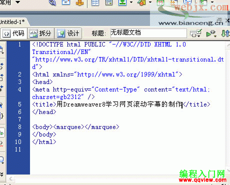 4.轉換到代碼視圖。把光標插入點放在 marquee標簽內。