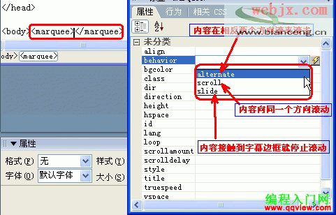 6.點擊behavior設置項右邊的下拉箭頭,選擇滾動字幕內容的運動方式。