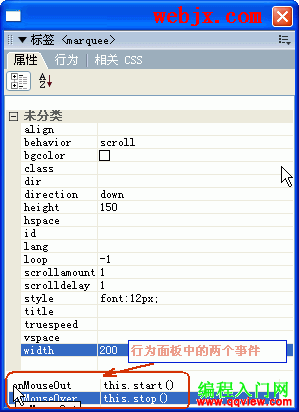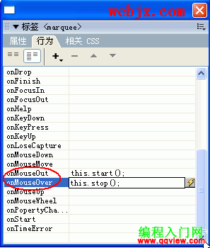 11.onMouseOver事件設置鼠標移動到滾動字幕時的動作,常設置為停止滾動。onMouseOut事件設置鼠標離開滾動字幕時的動作,常設置為開始滾動。在Dreamweaver8中需要打開“行為”面板設置。