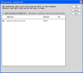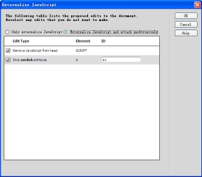 我們選擇”Externalize JavaScript and attach unobtrusively”,即同時完成代碼塊和標簽中代碼的分離,命令執行完成後,頁面的代碼如下: