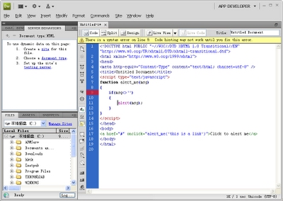 除此以外,DreamWeaver CS4 還提供了對代碼錯誤的提示,當代碼出現錯誤,將在窗口頂端有一個黃色的提示條,同時在代碼左側行號處標識,如圖: