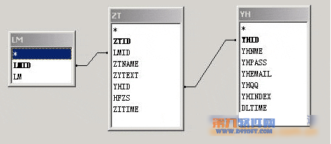 這一節講解的插入數據集可沒有上一節講解的那麼簡單。首先看看圖4-1-13,每個學習筆記將要顯示主題、發表時間、筆記分類(即所屬分欄目)、作者(姓名)、回復(個數),再來看看ZT表其設計圖(3.2節中的圖3-2-2),只有LMID(分類欄目的ID),沒有欄目名,這個要連接LM表才能取得;只有YHID(發表者的ID),沒有作者的姓名,這個要連接YH表才能取得;其它都可以從ZT表中獲得數據。“好復雜啊!”其實不用擔心,在Access中就可以解決一切困難。