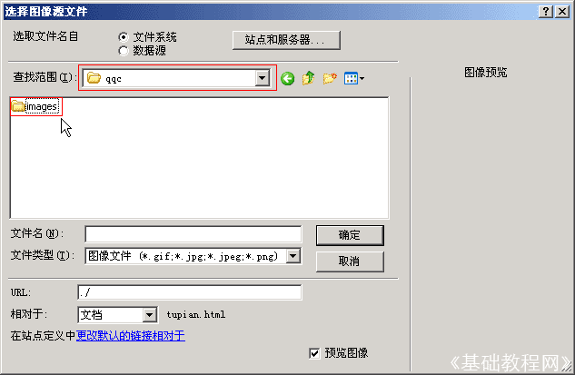 注意上面的“查找范圍”應該是站點的文件夾,中間是images文件夾,打開它,選擇剛才復制進去的圖片,點“確定”即可;