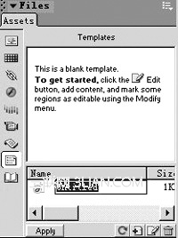 2、找到“Assert”子選項,在左邊的工具欄中單擊“Templates”按鈕,此時的模板為空,我們可以在右下角單擊“New Template”按鈕,一個空白的模板就會出現在面板中(如圖1),點擊模板名稱,是模板進入可編輯狀態。注意,此時的模板還沒有任何添加任何元素,我們可以像編輯普通網頁一樣在模板上添加表格、圖像、文字等。添加完後,保存模板,可以在默認站點文件夾的“Templates”子文件夾下找到剛才做好的模板,擴展名為.dwt。
