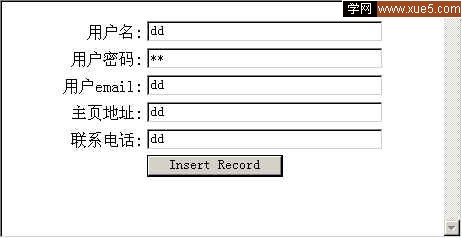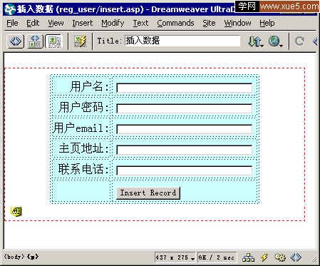 點擊OK後,生成如下圖所示頁面。哇!是不是很熟眼?哈哈,一個簡單的用戶注冊頁面就完成了,So Easy!如果你有興致的話,可以看一下Ultradev為我們生成的代碼,長的很呢!
