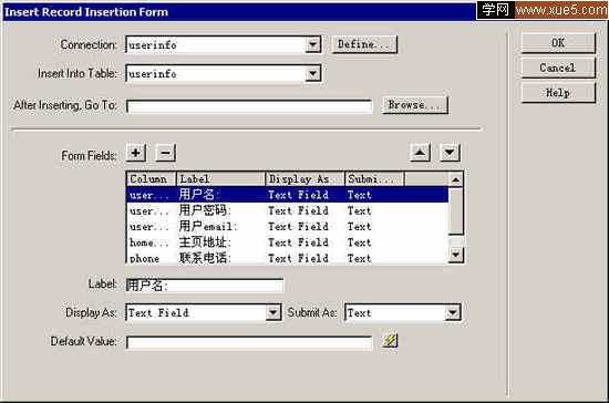 connection是我們已經在站點中已經定義好的數據庫連接,選中後,在Insert Into Table一欄中就會出現你所連接的數據庫中的表,從中再選擇你要插入數據的表。我們的數據庫只有一個userinfo表,選中他。接著在下面的Form Fields中就會出現我們在表設計中設計好的字段及其相關屬性,Column表示數據庫表中的字段名,Display As表示用何種類型的表單域,比如文本表單域(Text Field)來提交我們的紀錄,Submit As表示作為何種數據類型來提交,比如數據類型為整數性的字段我們就不能用文本數據類型進行提交。一般這一欄Ultradev會幫我們自動選擇的。Label呢則幫助提示你這個表單域填寫的內容。After Inserting, Go To一欄是當你提交完數據跳轉到那個頁面去的意思,比如一般注冊成功後都會跳轉到一頁,告訴你你已經注冊成功了,歡迎使用什麼什麼的,就是這樣子的。如果什麼都不填的話就表示提交完數據後返回本頁面。