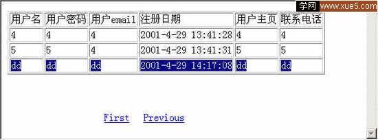 點擊Insert Record提交數據,然後跳轉至顯示數據的頁面,哈哈,看到了吧,我們剛剛輸進去的數據乖乖的躺在那裡了。相信你又一次體驗到了Ultradev的強大了,只需動幾下鼠標,一個功能完整的頁面就出來了,如果用手寫的話還不知道要寫到什麼時候,還得不停的測試。