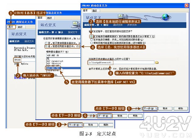圖 2-3 中的步驟 4 如果選擇的是【否,我不想使用服務器技術】,則站點為靜態網站,此時將直接執行步驟 6 。靜態網站與動態網站的區別不是指網站有沒有 GIF 、 Flash 動畫,而是指有沒有互動性。“互動性”是指網站根據用戶的要求和選擇能夠動態作出改變及響應,能夠自動更新網站,自動生成批量頁面,能夠根據用戶的條件(時間、浏覽器類型、用戶在站點的使用權限等),自動生成不同頁面。