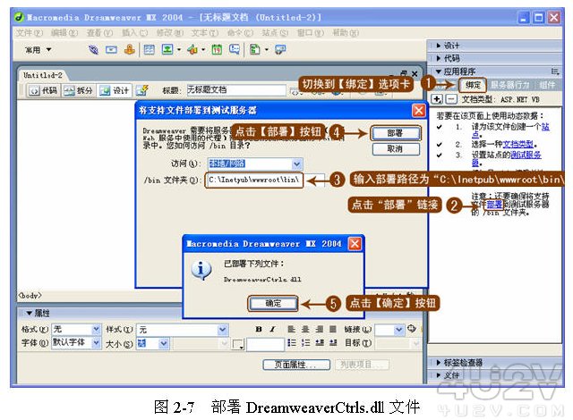 ( 2 )設置部署目錄。切換到【應用程序】面板,選擇【綁定】選項卡,單擊【部署】按鈕,在彈出的【將支持文件部署到測試服務器】對話框中將部署目錄設置為“ C:Inetpubwwwrootbin ”,如圖 2-7 所示。