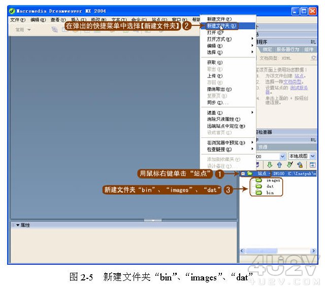 在文件面板中為站點“ Dreamweaver100 ”建立新文件夾“ bin ”、“ images ”、“ dat ”,如圖 2-5 所示。