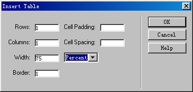 單擊“Object”面板中的“表格”圖標或者選擇菜單“Insert”-“Table”,在網頁中適當的位置插入一個高,寬均為1的表格對象。如圖