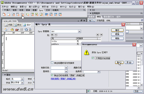 【確定】插入Spry表,提示需要插入Spry區域。因為所有的Spry XML 數據必須在 Spry區域中才能顯示。