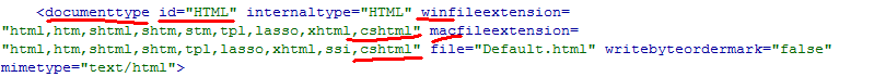 然後修改id為“HTML” 的documenttype標簽裡面的winfileextension和macfileextension屬性,在那兩個屬性裡面添加文件類型