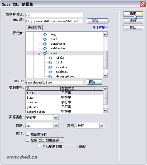 彈出【Spry XML 數據集】對話框,【XML源】可以是本地目錄下的XML數據,也可以是跨域的遠程XML數據。