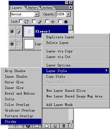 首先用Firework或Imageready一類的軟件制作出幾幅動態的GIF花瓣圖片來。以ImageReady3.0為例子。按Ctrl+N新建一個文件,大小100*100左右,背景色可根據網頁的背景自行設定。按Ctrl+Shift+N新建一層,取名Flower1,用勾畫工具(Polygonal Lasso Tool),勾畫出一個花瓣的外形,如圖1所示。然後將前景色設為粉紅色(顏色代碼為:FF99FF),按Edit/Fill填充,然後在層面版的 Flower1上按右鍵,選擇Layer Style/ Stroke,如圖2所示。在彈出的Stroke面板裡的選擇色彩的地方選擇一個比剛才的粉紅略深的顏色,(顏色代碼為:C764B4),Size選擇為 1,這樣花瓣就被描邊,看上去更真實一些。這樣一個花瓣就制作完成了。