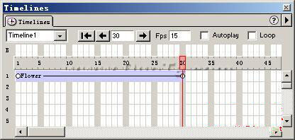 打開Dreamweaver,按Ctrl+N新建一個Html文檔。然後按Insert/Layer,插入一個圖層,取名為“flower1”,在圖層中按Insert Image,插入我們剛才所做的那幾幅圖片中的一幅,將圖層的大小變得和圖片的大小一樣,點擊選中該圖層(選中後一定要是圖6的樣子才是選中了圖層),確定選中圖層而不是圖片,然後選擇Modify/Timeline/Add object to Timeline,此時該圖層會加入等時線,這時候等時線上會出現兩個空心的句號樣的圓圈,用直線連接起來,兩個圓圈表示是關鍵影格,確定了花瓣移動的軌跡。如圖7所示。