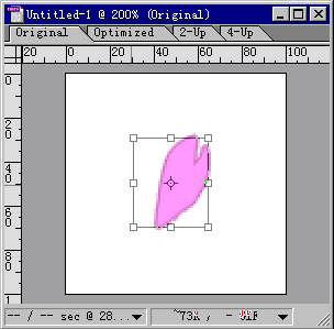 然後在動畫面板上,選中第二影格的位置,回到層面板,顯示Flower2層,隱藏Flower層。然後選中Flower2層,按Ctel+T,這時花瓣處於自由變換狀態,可以用鼠標左右上下移動來改變花瓣的形狀。如圖5所示。