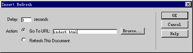 制作一個新的首頁作為重定向的頁面。用“ head ”對象面板的“ Insert Refresh ”定向到未使用 Flash 技術的網頁,如圖。它會在頁面頭部加上如下代碼: < meta http-equiv="refresh" content="4;URL=noflash.htm">