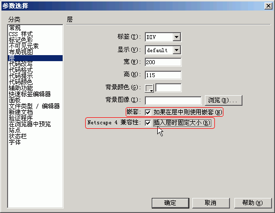 在使用嵌套層之前,先要對層做一些參數設置。選擇“編輯”/“參數選擇”菜單,在“參數選擇”對話框中,選中“Netscape 4 兼容性:插入層時固定大小”,這樣制作的嵌套層就可以兼容Netscape 4浏覽器。並且選中“嵌套:如果在層中則使用嵌套”。