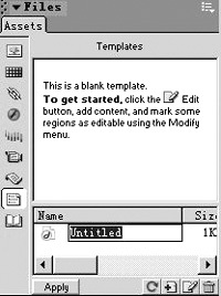 2、找到“Assert”子選項,在左邊的工具欄中單擊“Templates”按鈕,此時的模板為空,我們可以在右下角單擊“New Template”按鈕,一個空白的模板就會出現在面板中(如圖1),點擊模板名稱,是模板進入可編輯狀態。注意,此時的模板還沒有任何添加任何元素,我們可以像編輯普通網頁一樣在模板上添加表格、圖像、文字等。添加完後,保存模板,可以在默認站點文件夾的“Templates”子文件夾下找到剛才做好的模板,擴展名為.dwt。