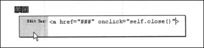11. 可以通過為該鏈接應用Open Browser Window行為來設置單擊鏈接時打開Index.html窗口,不過更方便的方法是利用快速標識編輯器。方法是首先將插入點放置到鏈接中,然後在狀態欄左端的標識選擇器上,單擊標識按鈕,選中整個鏈接。然後按下Ctrl+T組合鍵,打開快速標記編輯器,進入到快速標記編輯器的 編輯標識模式。再在“>”前輸入“onclick="window.open('index.html',null','width=200px,height=200px')"”(如圖4所示)。設置完畢,按下回車鍵,確認操作。