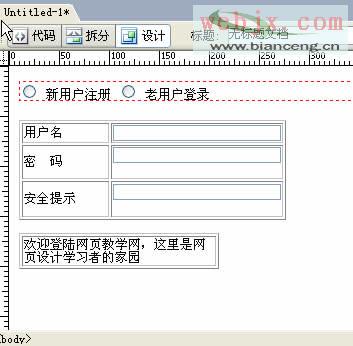 radiobutton1供新用戶注冊點擊,radiobutton2供老用戶登錄點擊。再添加一個表格,用來顯示新用戶的注冊登記區域。在表格中插入需要的相關元素、文字;再插入一個表格,用來顯示老用戶登錄區域,同樣在表格內插入相關內容。這樣,我們就簡單地設計好了界面。