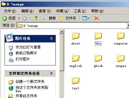 1,打開電腦,在D盤下建立一文件夾newgn(這個夾子就是你的站點存放點了),並且在裡面建幾個子文件夾(就好似你網站的子目錄)